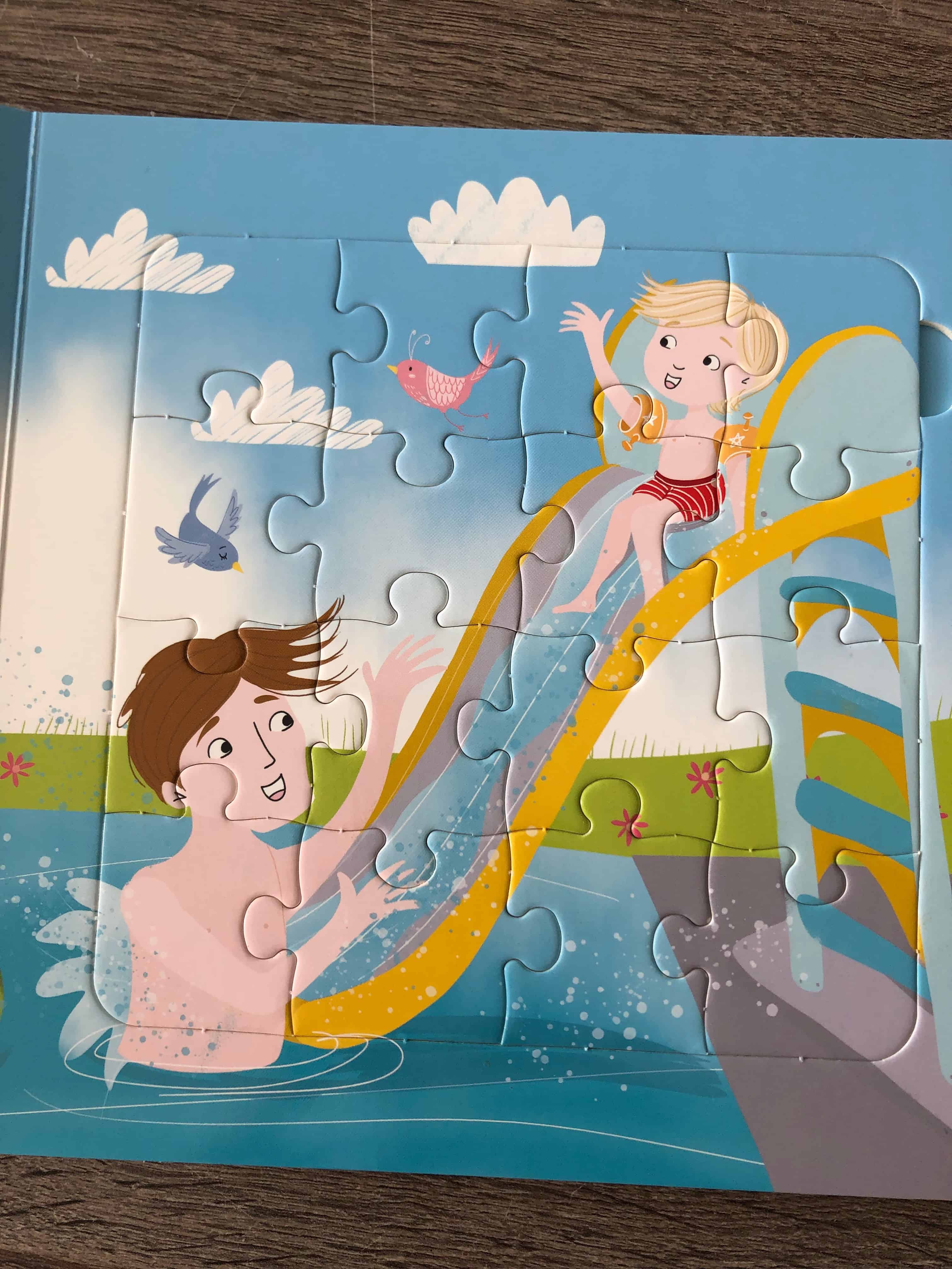 Zoals ik al schreef zijn de puzzels erg schattig. Het probleem is echter, dat de stukjes heel vast zitten. Dat is logisch, want ze mogen natuurlijk niet uit het boek vallen als je het gewoon opendoet of leest, maar toch blijft het lastig. Ik krijg zelf namelijk al nauwelijks de stukjes goed in de puzzel gedrukt, laat staan dat mijn zoontje van twee dit kan. Het is dus erg leuk bedacht, maar iets minder in de uitvoering. Al blijven natuurlijk de verhaaltjes en illustraties als een huis boven water staan.