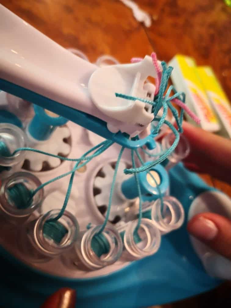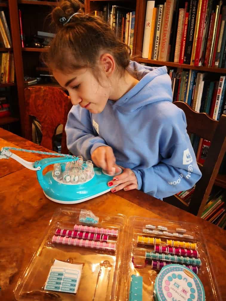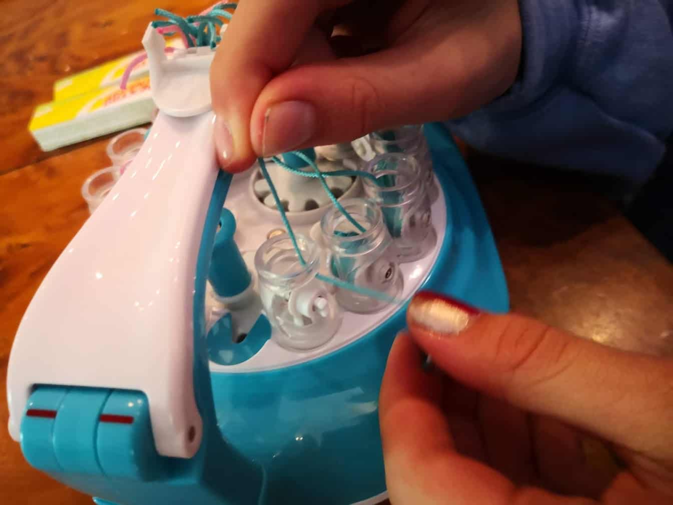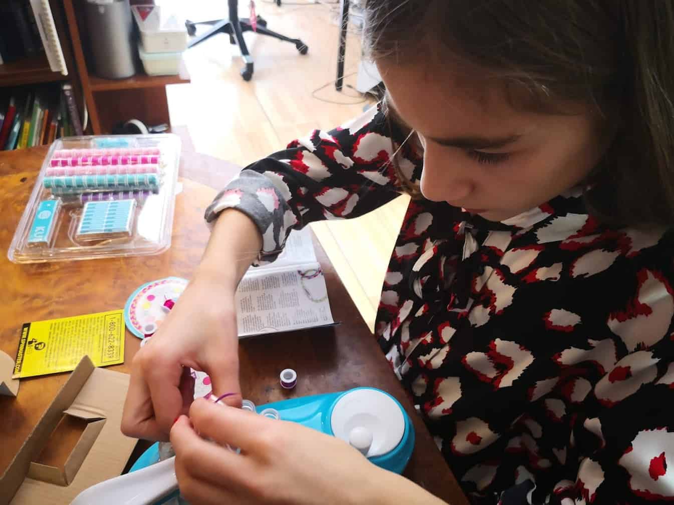 Zoals ik al aangaf, vind ik dit soort pakketten er altijd ingewikkeld uitzien. Mijn dochter heeft daar geen last van en begint gewoon systematisch met uitpakken en klaarzetten. In no-time heeft ze de juiste klosjes voor de eerste armband uitgezocht en geïnstalleerd. Erg knap van haar (vind ik).
