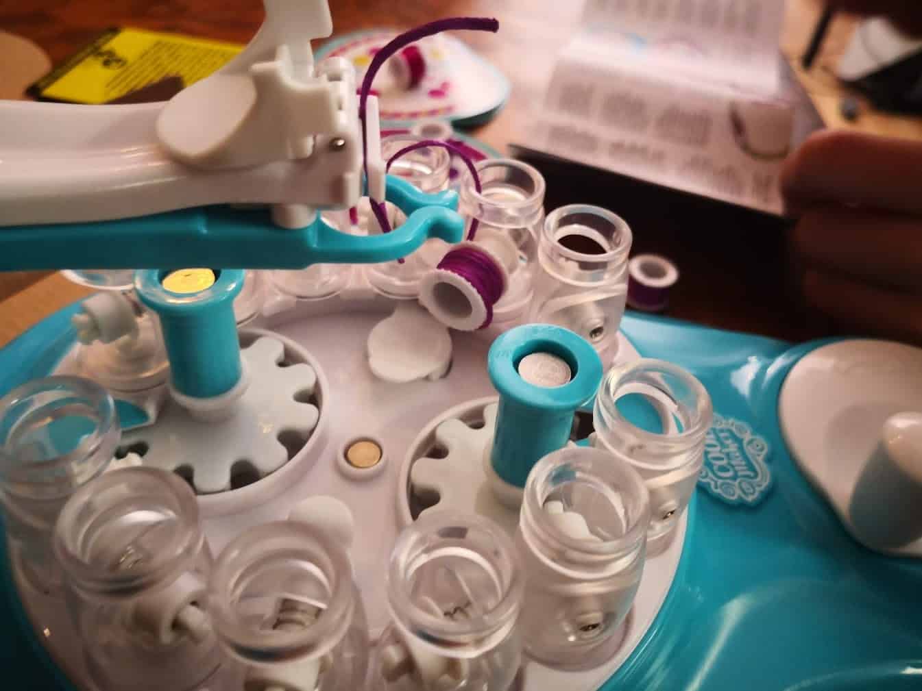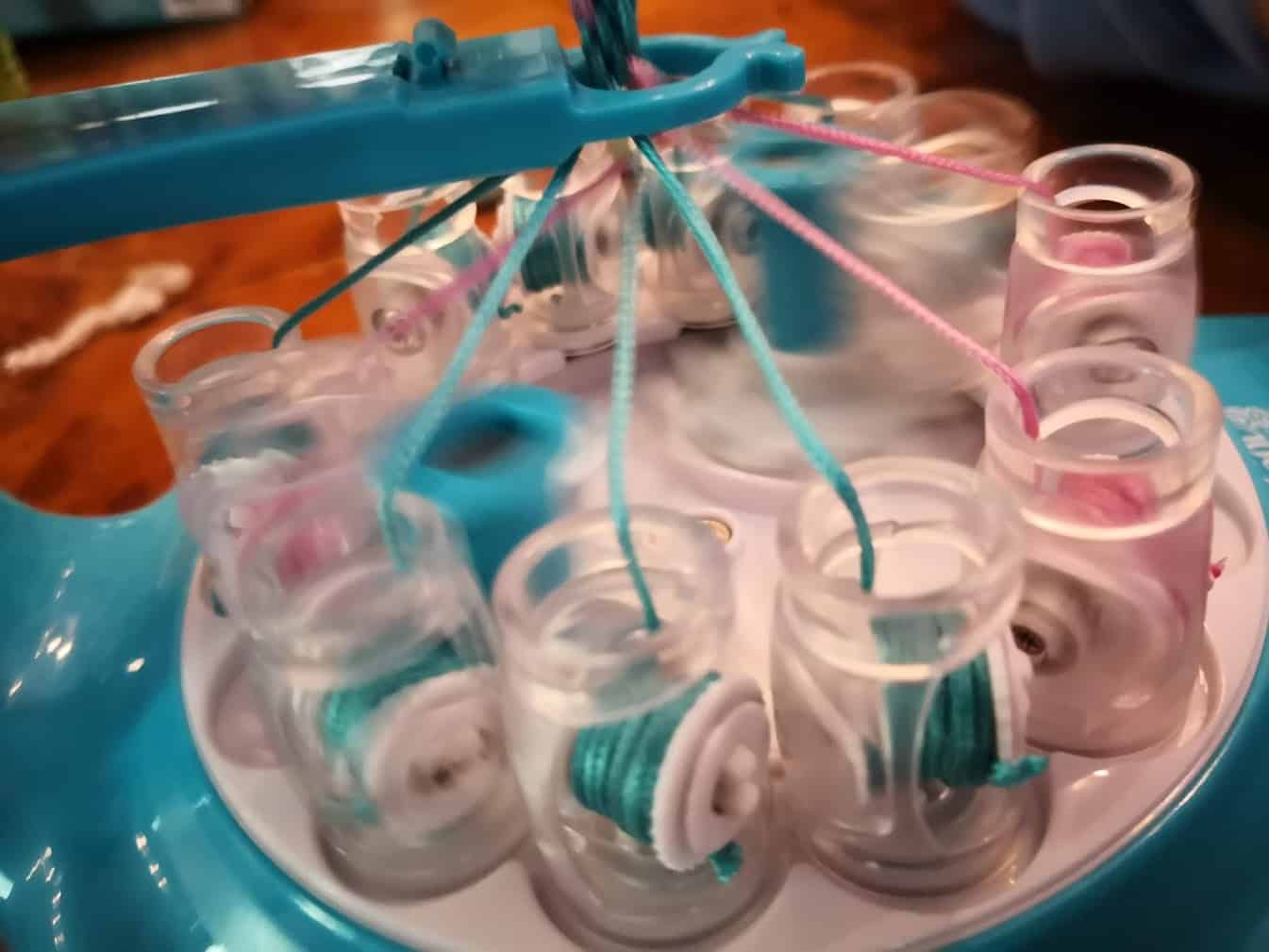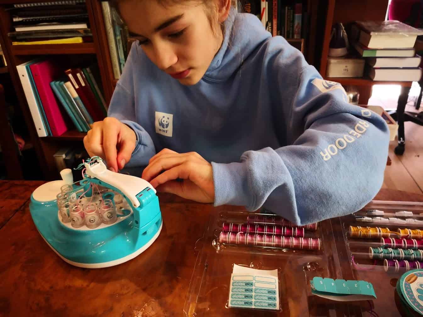 Zoals ik al aangaf, vind ik dit soort pakketten er altijd ingewikkeld uitzien. Mijn dochter heeft daar geen last van en begint gewoon systematisch met uitpakken en klaarzetten. In no-time heeft ze de juiste klosjes voor de eerste armband uitgezocht en geïnstalleerd. Erg knap van haar (vind ik).