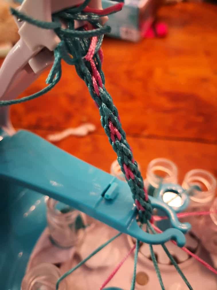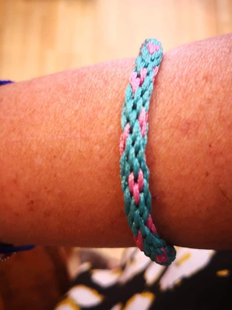 Er zitten verschillende ‘patronen’ bij deze zet. Voor mij maakt mijn dochter een patroon waardoor ik een blauwe armband krijg met roze hartjes. Mooi!