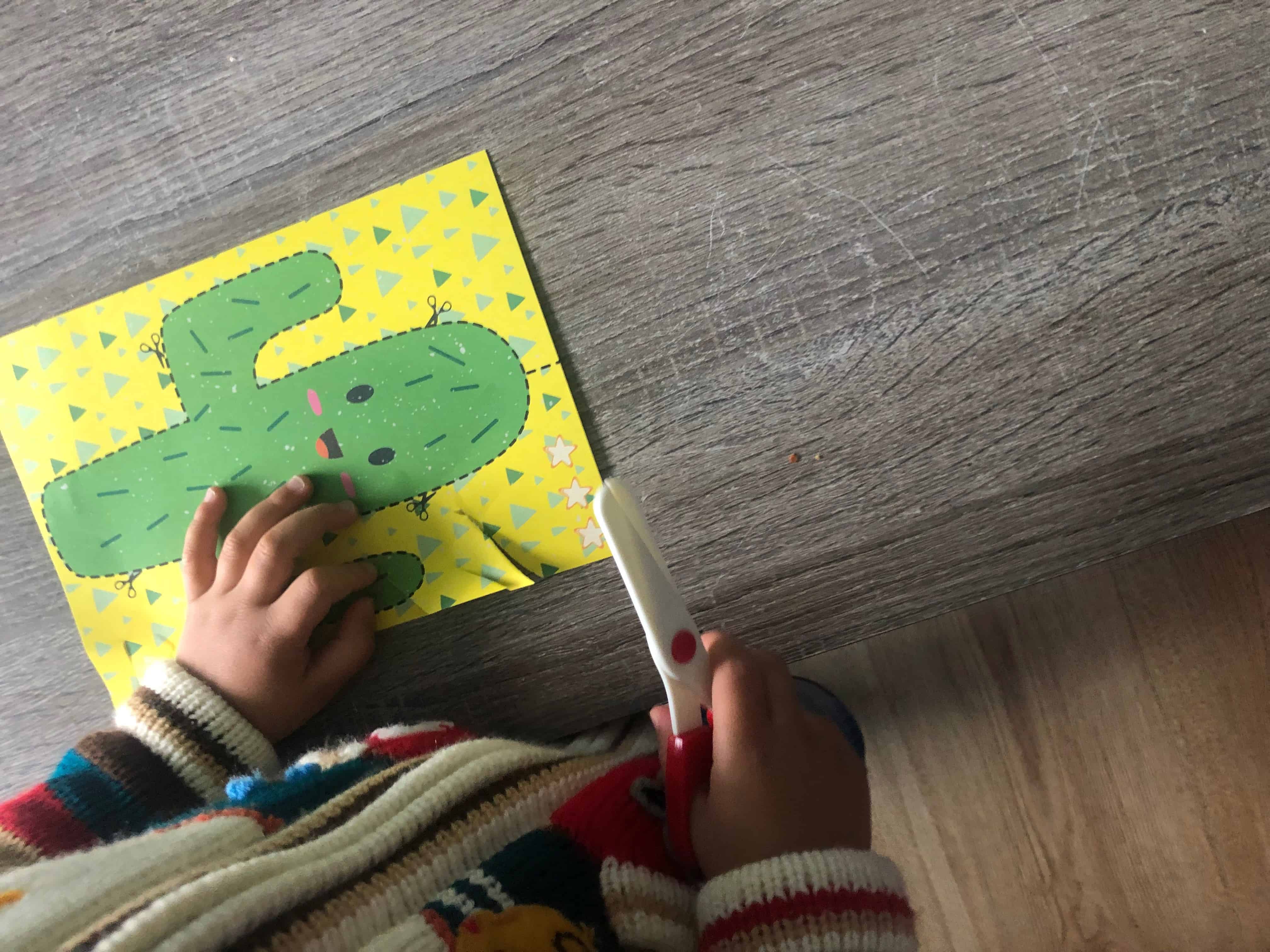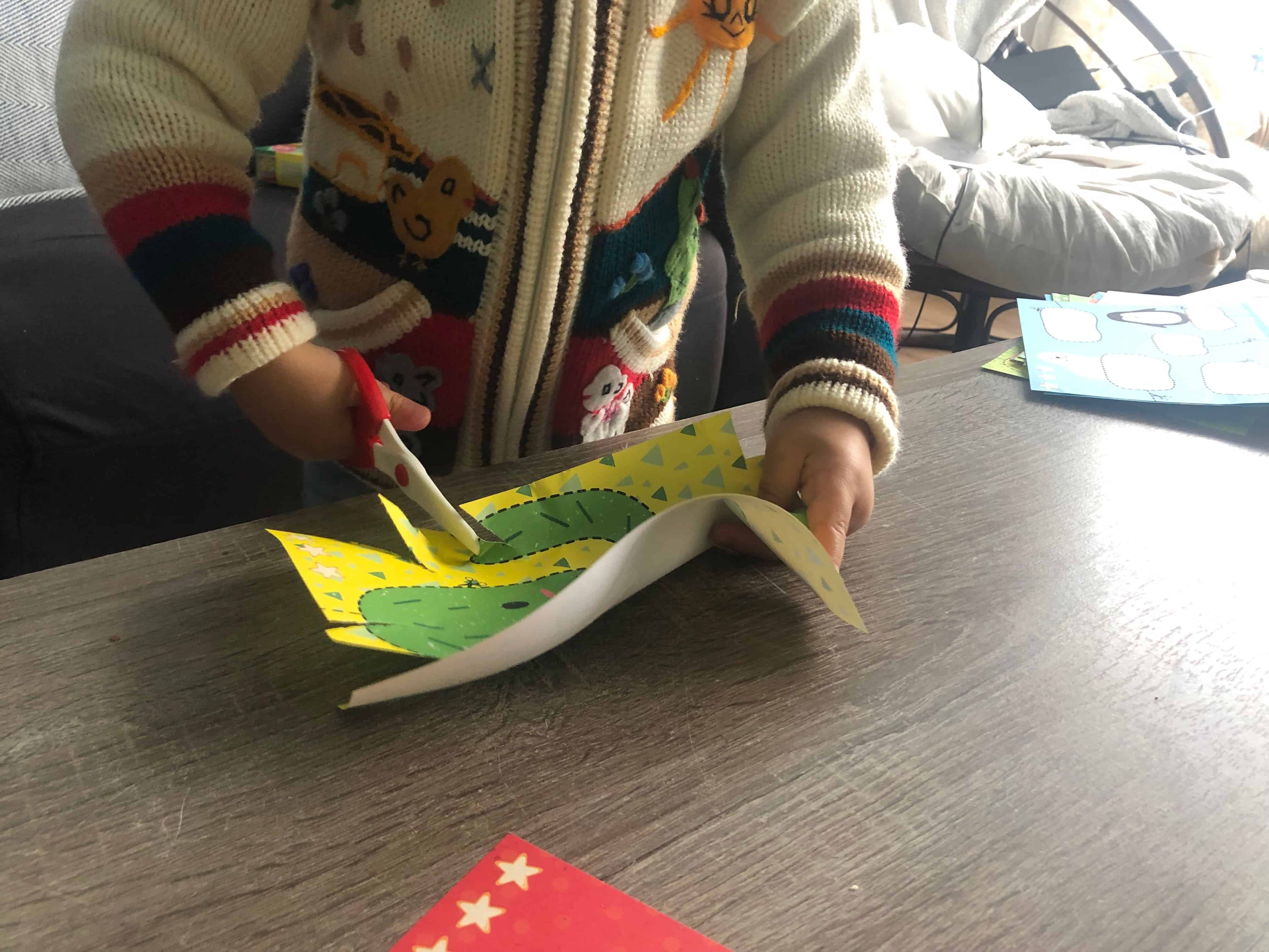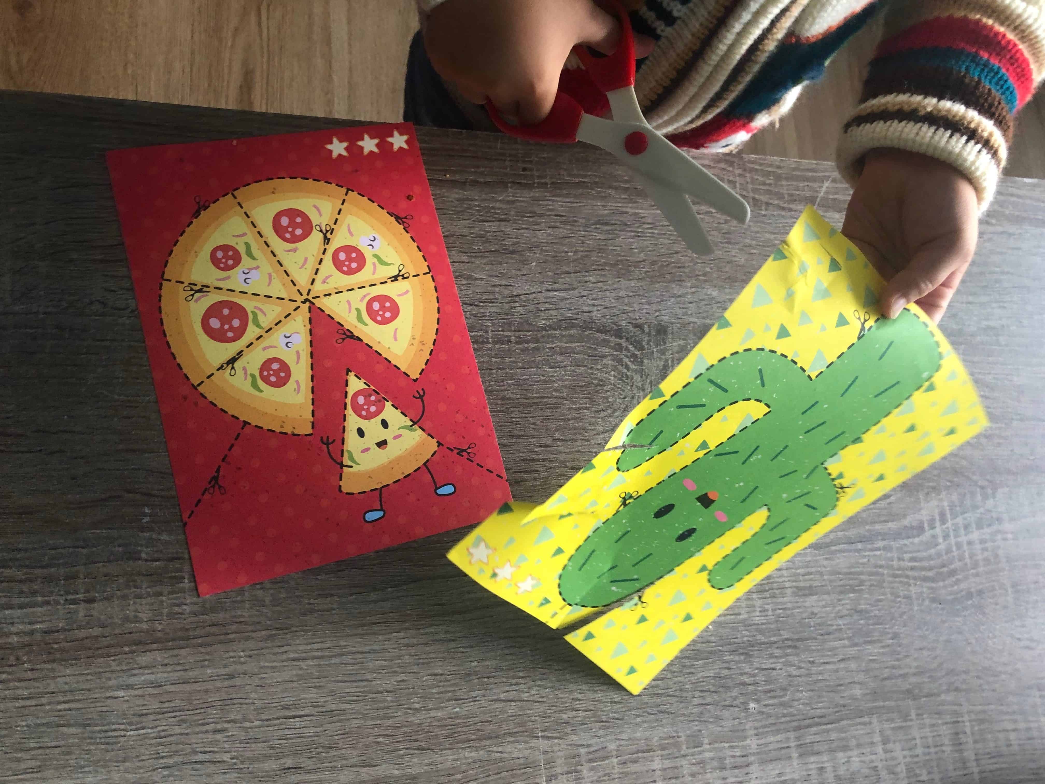 Het prettige aan de setjes is dat er meestal een bepaald “trucje” in zit. Bij het verven met water is het bijvoorbeeld dat je met water juist de kleuren krijgt en niet kunt knoeien en bij dit setje is de schaar de ster van het verhaal. De schaar kan namelijk alleen in papier knippen en niet in haren of kleding. Daardoor lopen andere materialen geen gevaar. Ik moet zeggen dat je het wel merkt aan de schaar. Het knippen gaat bij gekreukte delen of hele kleine randjes wat moeizamer. Toch maakt dat niet heel veel uit, het knippen is leuk genoeg. Note to self: wel even zorgen dat de belangrijke brieven een eindje uit de buurt blijven, want als ze eenmaal de smaak te pakken hebben…