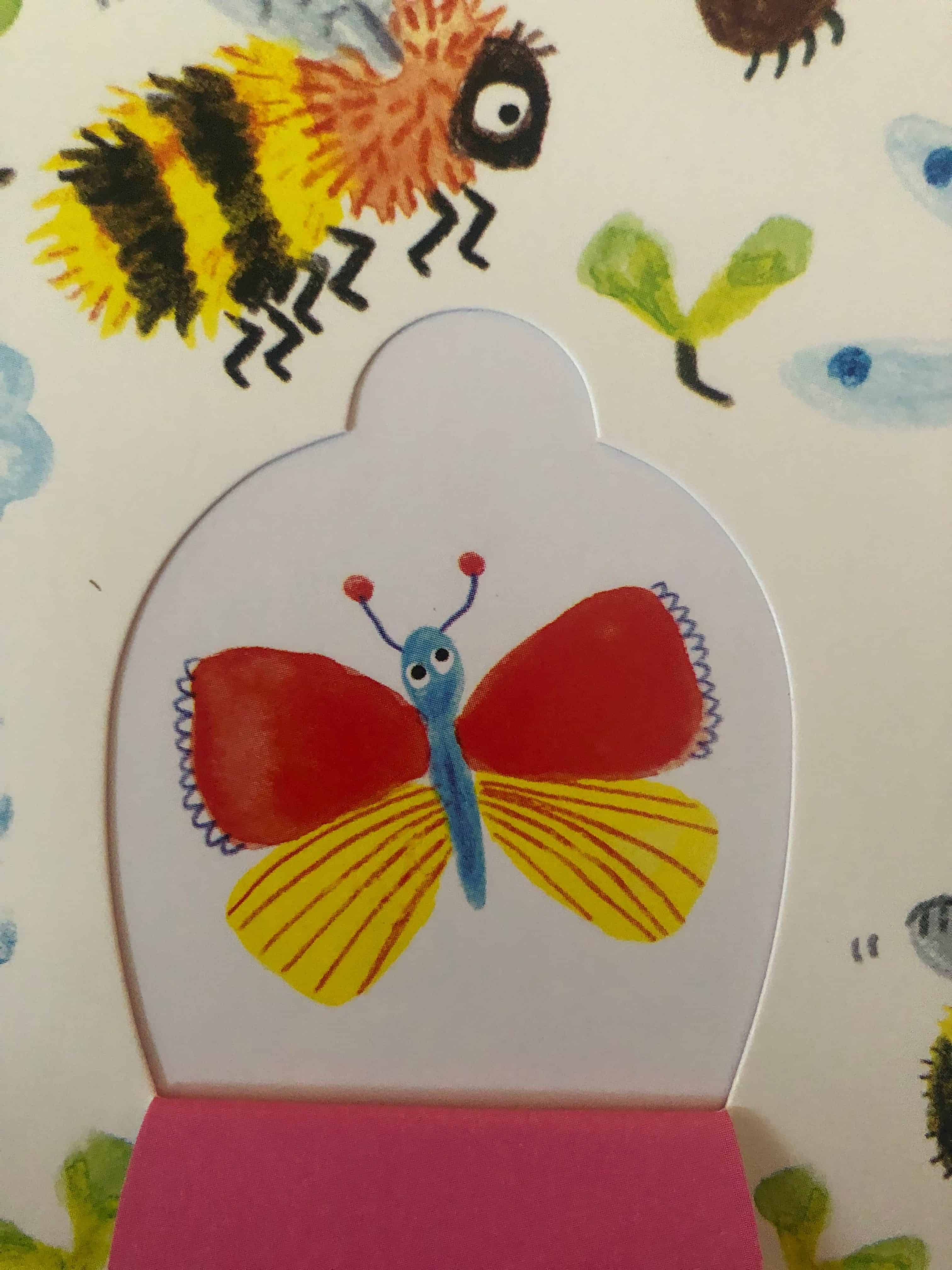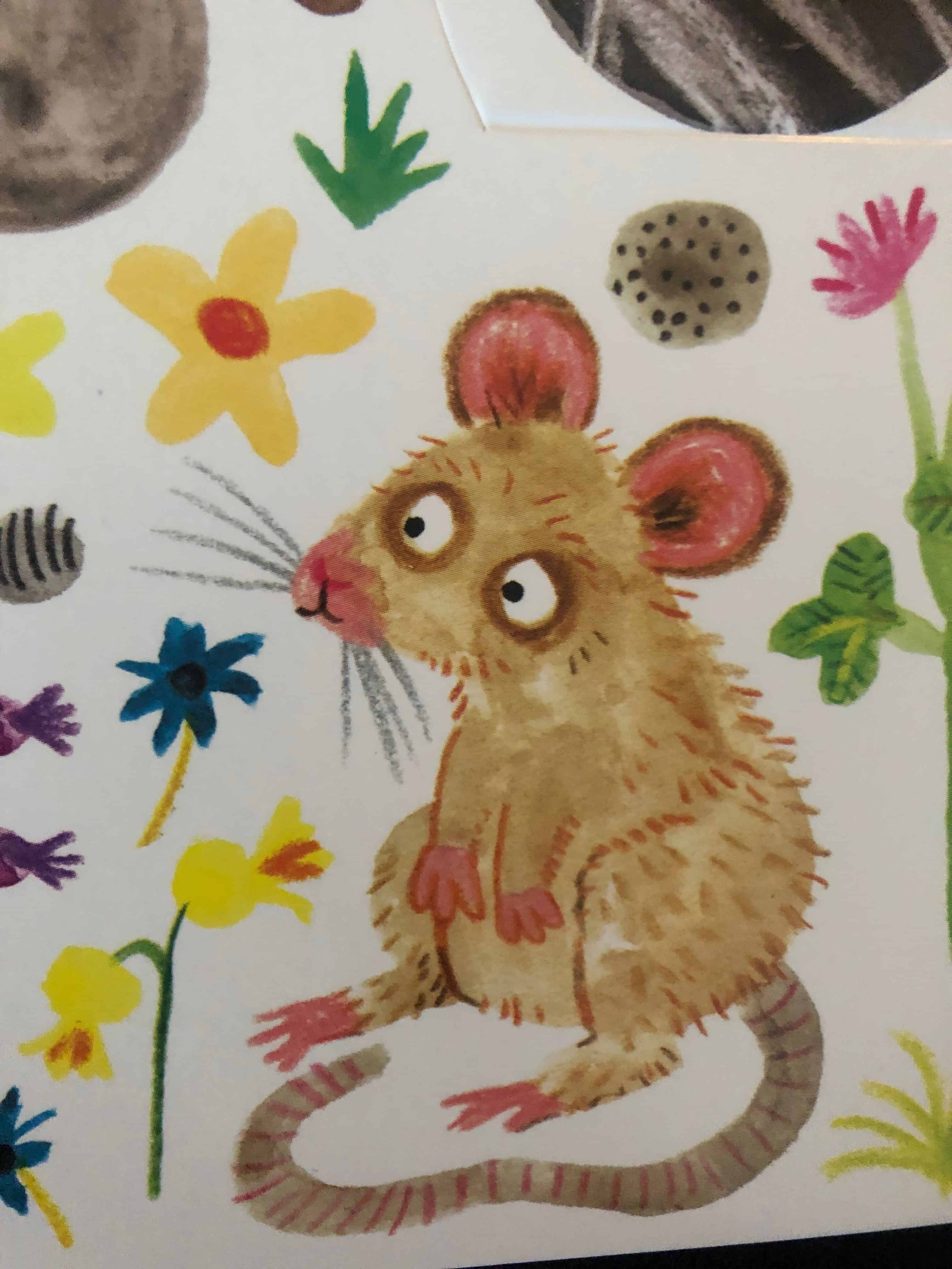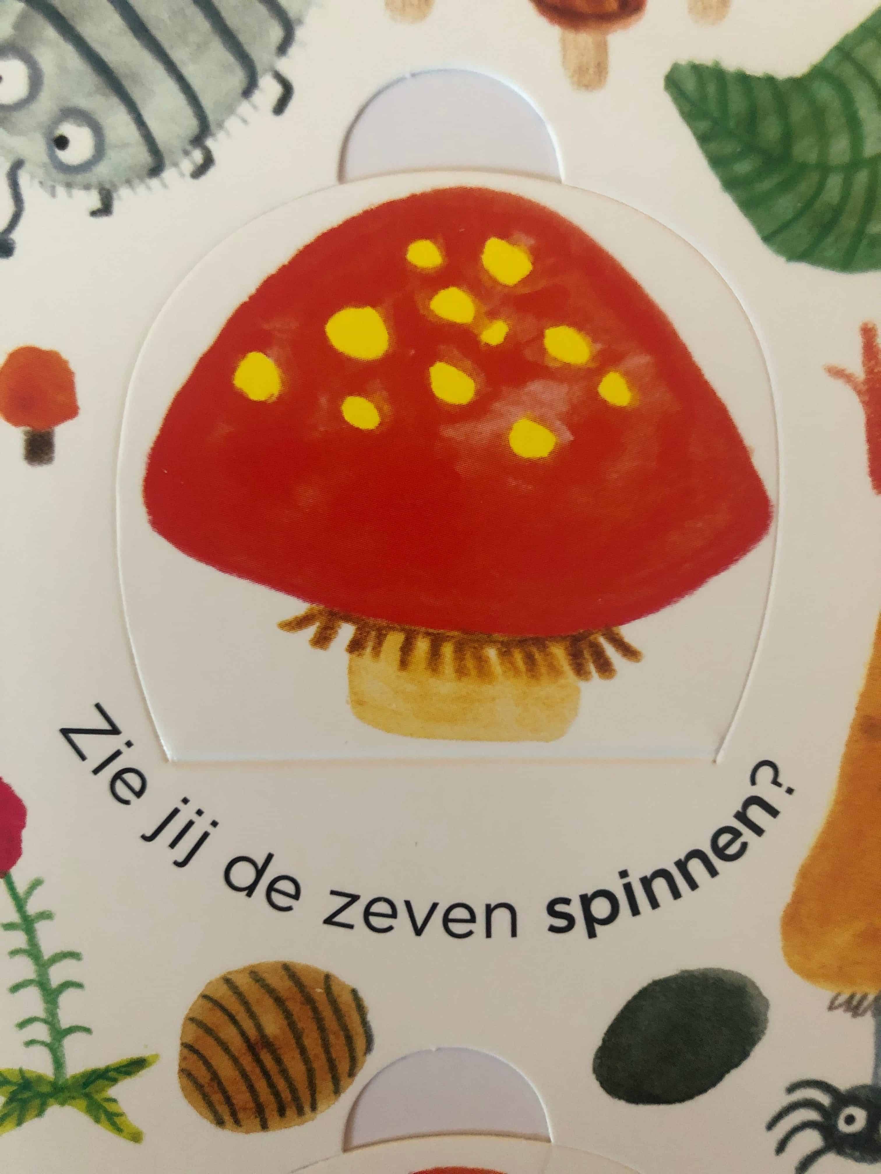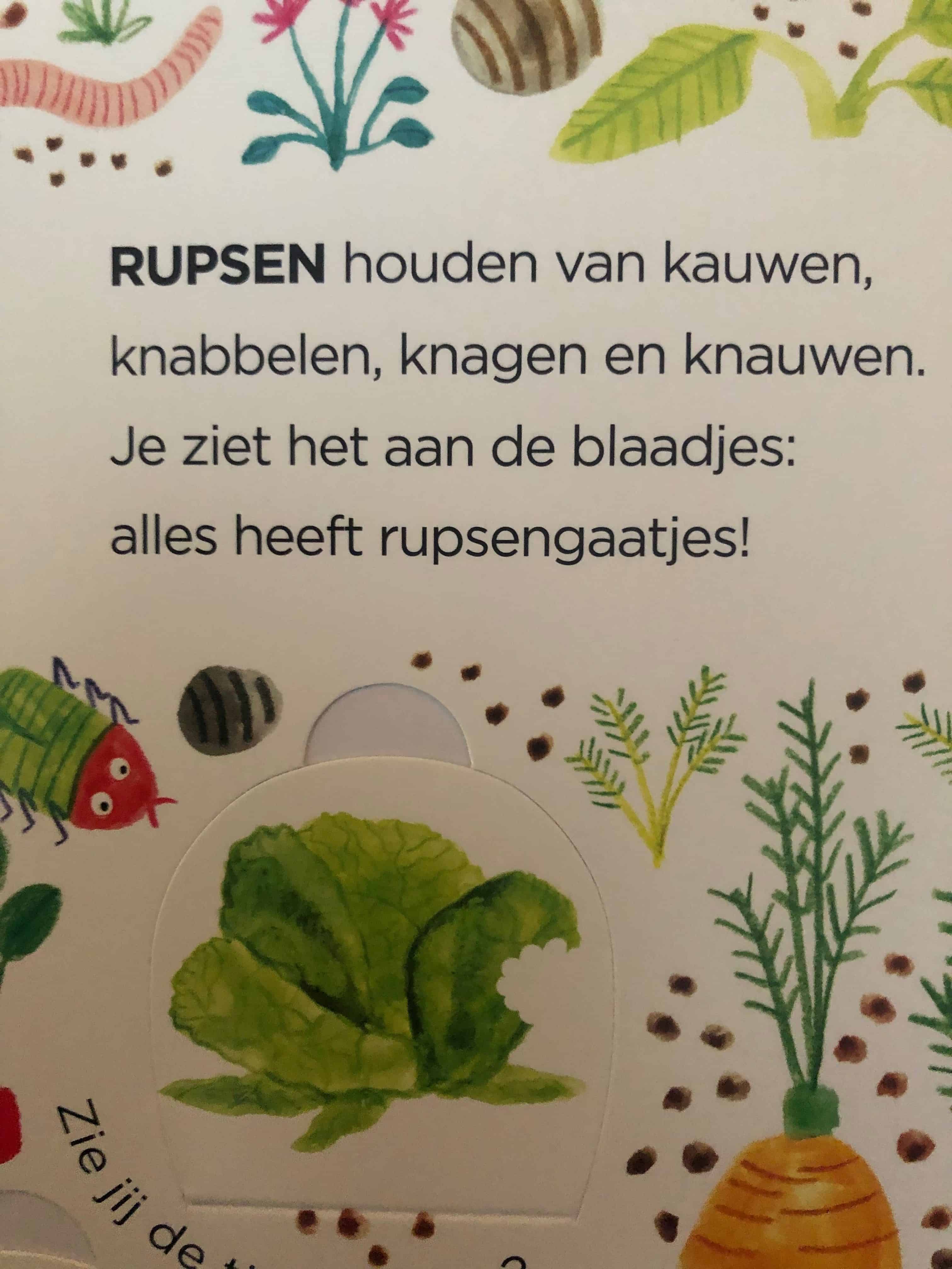 Daarnaast zijn er ook gewone tekstjes te vinden. Dit zijn korte, behapbare versjes die goed passen bij de frisse illustraties. Een tekst als “Rupsen houden van kauwen, knabbelen, knagen en knauwen. Je ziet het aan de blaadjes: alles heeft rupsengaatjes!” is natuurlijk erg schattig en spreekt tot de verbeelding van kinderen. Het boekje is daarmee een heel erg mooi geheel. Het is een gezellig tijdverdrijf om samen met je kleintje te speuren naar de (verstopte) diertjes in het boek.