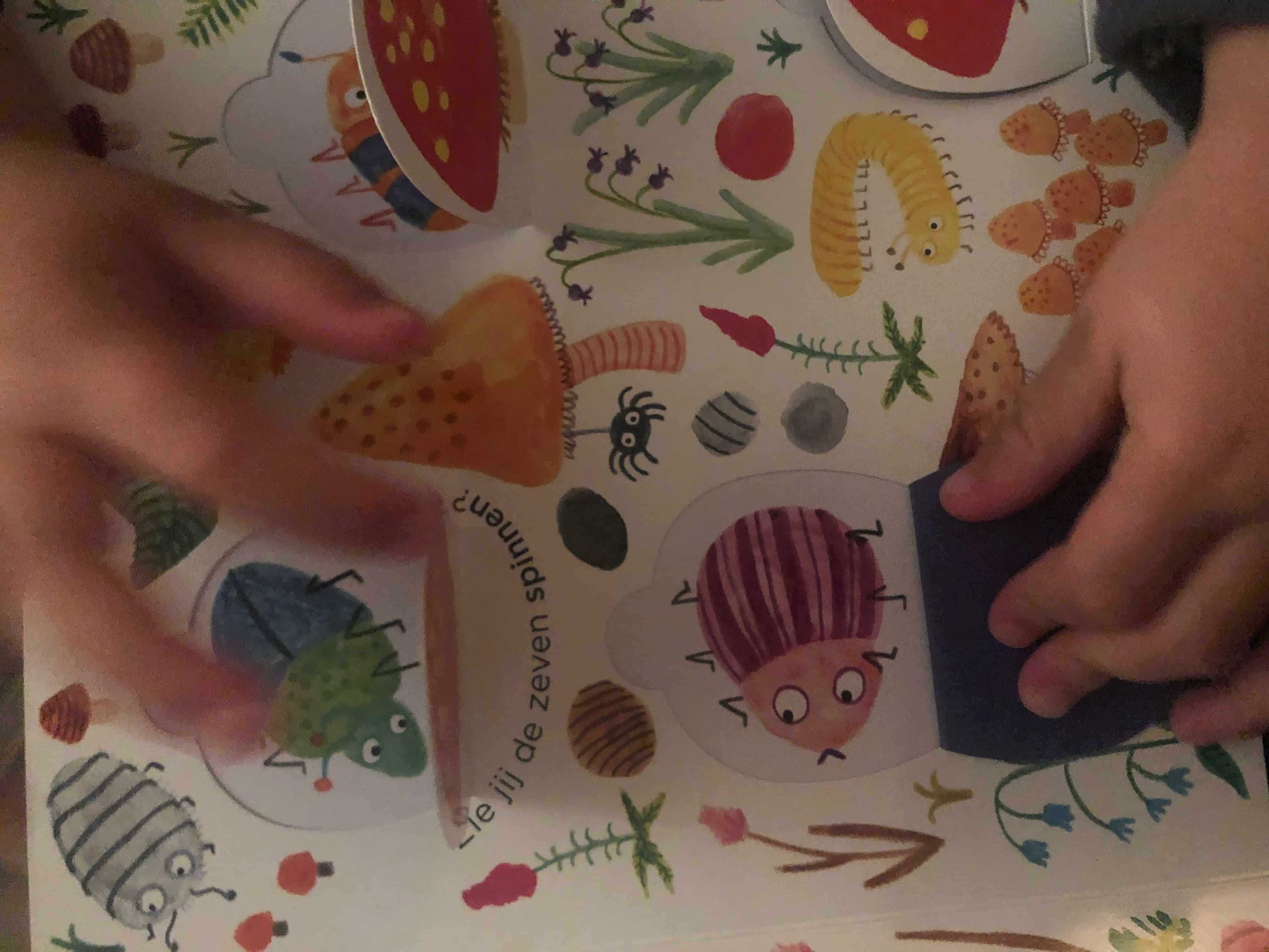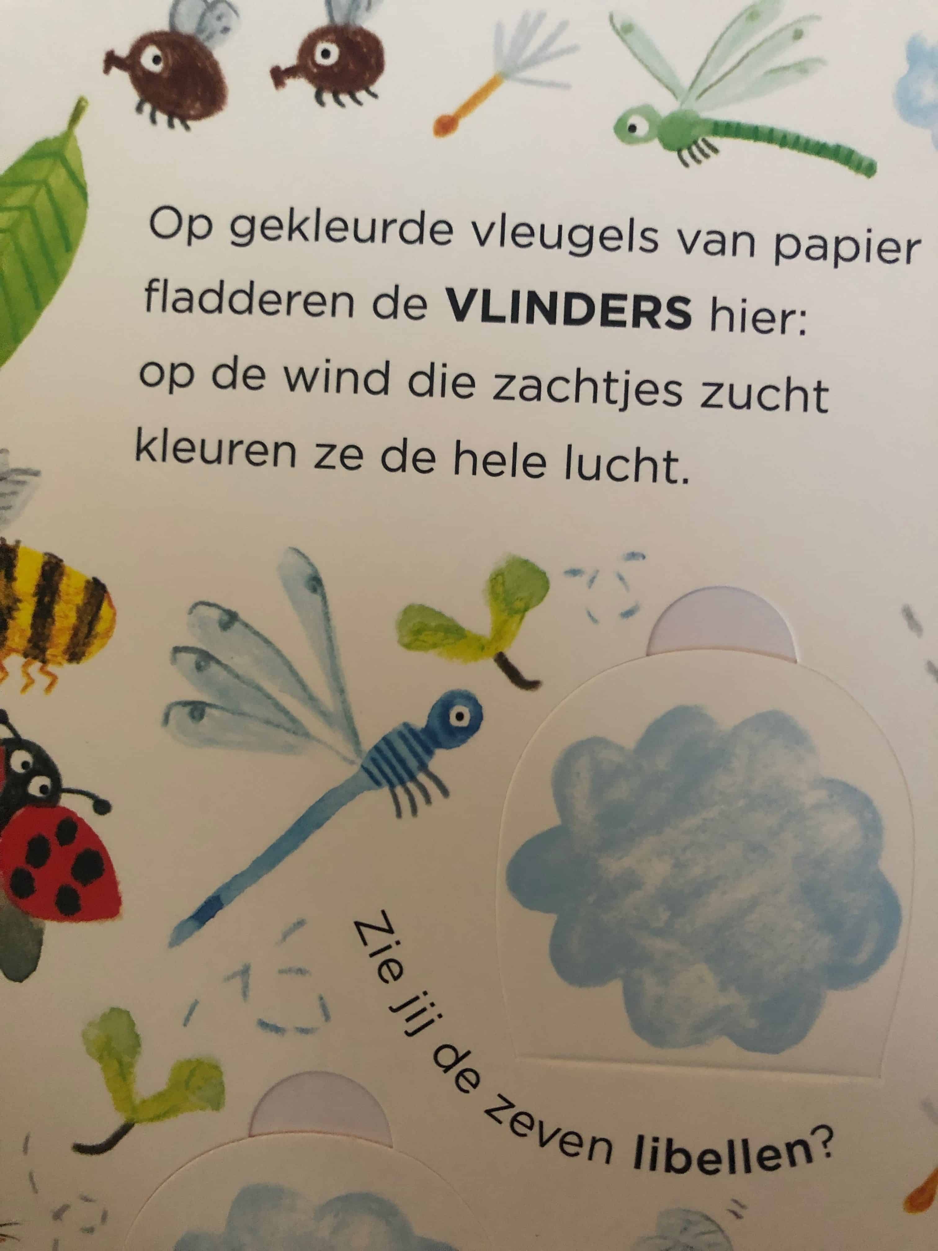 Op elke dubbele pagina staan 7 afbeeldingen onder de flapjes. Er is er dus 1 extra waardoor de paren niet uitkomen. Dat maakt het voor oudere kindjes ook leuk, want het is niet al te makkelijk omdat ze misschien wat langer door blijven zoeken naar de dubbele die hoort bij de overgebleven afbeelding. Mijn zoontje is met zijn ruim 2,5 er nog iets te klein voor om het extra “fopdiertje” te begrijpen. Dat neemt echter niet weg dat hij het opendoen van de flapjes en de andere opdrachtjes die erin zitten verwerkt erg leuk vindt. Hij leert er op deze manier ook nog eens veel nieuwe dieren bij, zoals kevers, libellen en sprinkhanen. En dat is voor mij een van de hoofdredenen om veel te lezen met mijn kind. Er komen in boeken namelijk vaak woorden voor die je in het dagelijks leven niet zo vaak gebruikt.