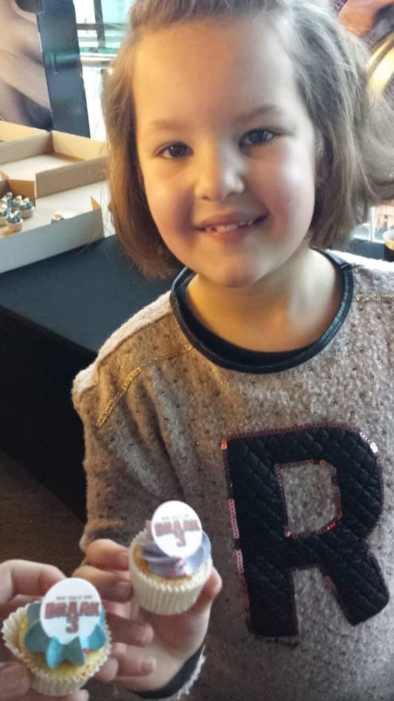 Vanuit de parkeergarage naar de bioscoop was het eventjes hollen, want het was snertweer. Perfect weer om in de bios te zitten overigens. Eerst even de kaartjes opgehaald en toen snel doorgelopen naar een kopje thee, limonade en een croissantje. Ook waren er voor de gelegenheid mooie mini muffins gemaakt met het filmlogo erop, tot groot genoegen van onze Daphne …