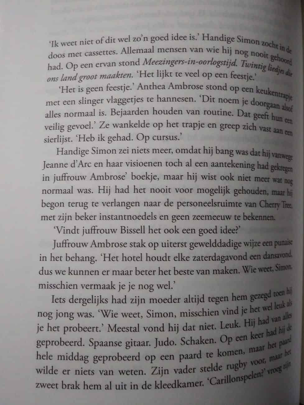 Florence is aan het dementeren, en daardoor is het een aandoenlijk persoontje. Met deze wetenschap zijn haar gedachten en haar tijdsprongetjes goed te volgen. Het is absoluut geen zwaar boek, want in haar verwarring zegt ze dingen die er soms niet toe doen, maar die wel komisch verkeerd vallen. De rode draad is het zoeken naar het waarom zij die manspersoon herkent en niet weet waarvan. Dat alles zorgt voor een prettige spanning en een ontluisterd slot van dit aanbevelende boek.