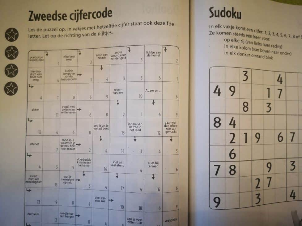 Ik denk dat ik nog nooit op vakantie ben gegaan zonder een doos met boeken (of een e-reader vol) en een aantal puzzelboekjes. Meestal zijn dat van die ‘logische denkpuzzels’ en cryptogrammen maar soms ook een zomerbundel met van alles wat, of een puzzelboek met Zweedse puzzels. De kinderen doen dan graag mee.