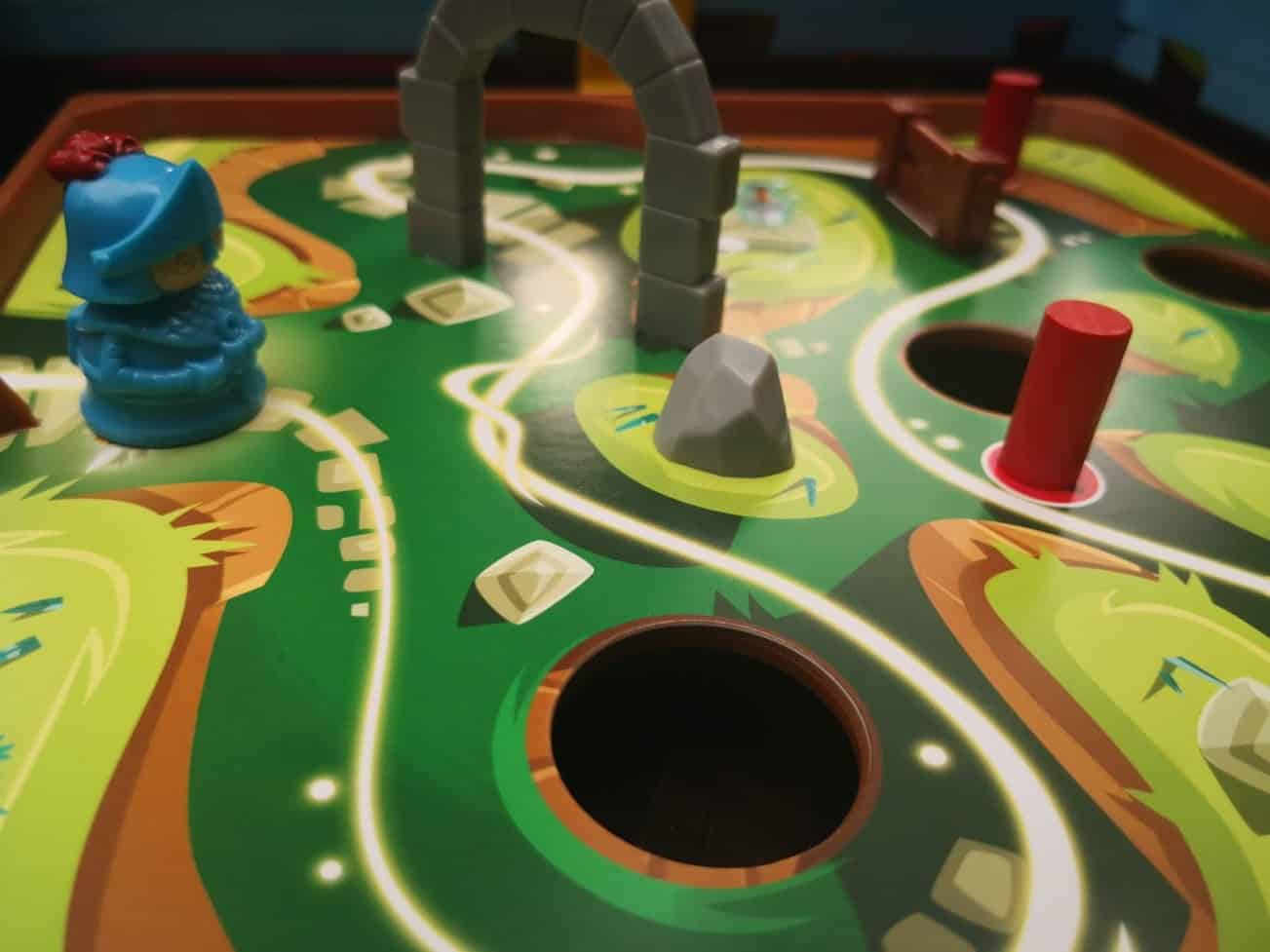 Het is best spannend om dit spel te spelen. Wanneer je heel voorzichtig samen je ridder een stuk over het bord verplaatst hebt, en je moet dan ineens langs een gat, wordt het echt even adem inhouden…. En later in het spel wordt het nog lastiger!