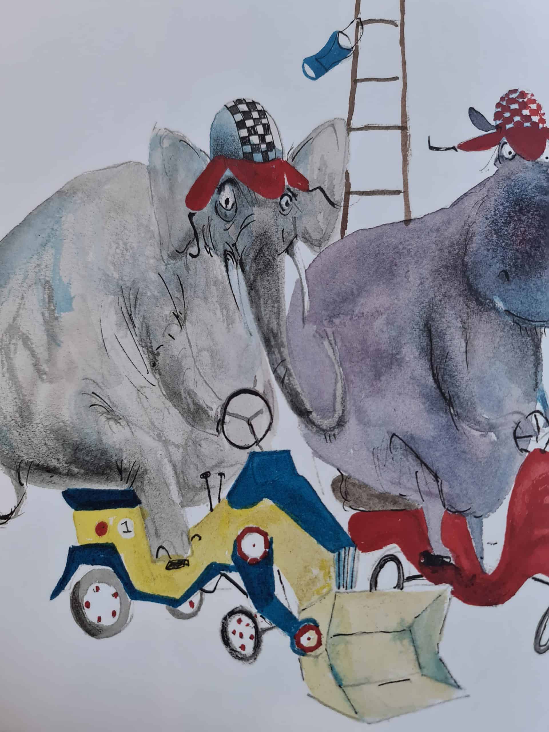 Nijlpaard, de varkens Knor en Knor, Olifant, Neushoorn, Muis en Tijger doen mee aan de grote race om de gouden beker. Allemaal scheppen ze op.