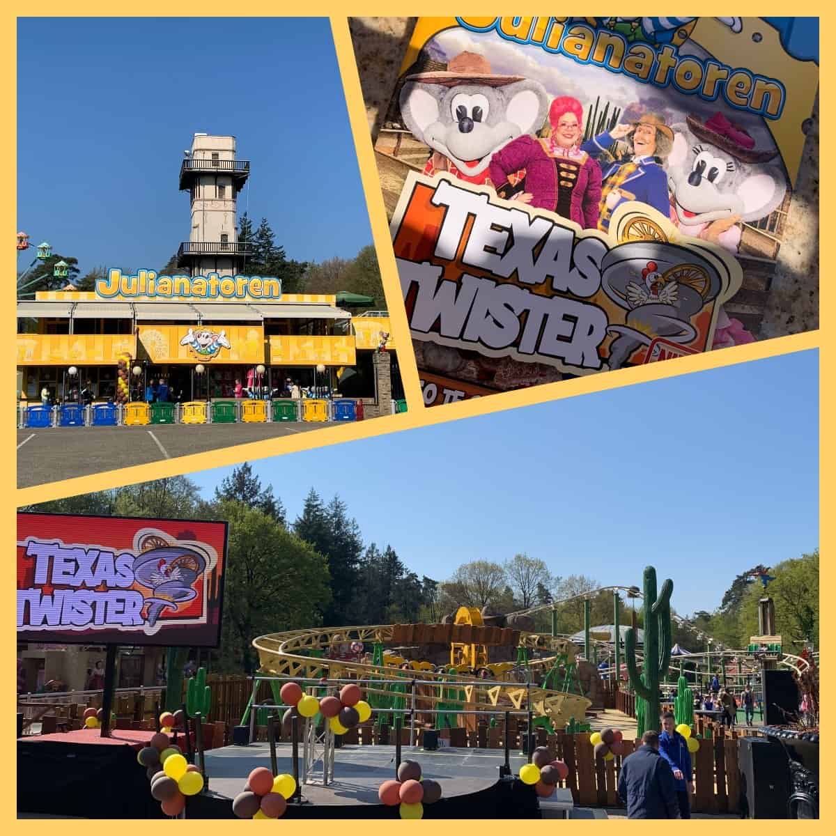 Je kent het vast wel, zo’n dag met een gouden randje. Kinderen goed gehumeurd, het zonnetje schijnt en we vertrekken op precies de afgesproken tijd naar kinderpretpark De Julianatoren. Vandaag waren we uitgenodigd voor de opening van de Texas Twister.