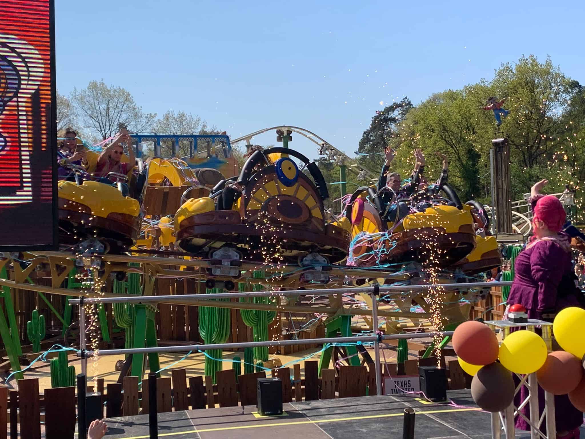 Wij mochten bij de opening aanwezig zijn en stonden mooi vooraan. Meneer Kaasschaaf en mevrouw Suikerspin vertelde een stukje van het verhaal. Ook Jul en Julia mochten samen komen dansen en zingen. Het was een gezellig feestje! De boeven probeerde de lancering nog te saboteren maag gelukkig stampte en danste de kinderen de boeven weg. De confetti slierten knalde, vuur spoot omhoog en de Texas Twister ging op reis voor hun eerste rit.