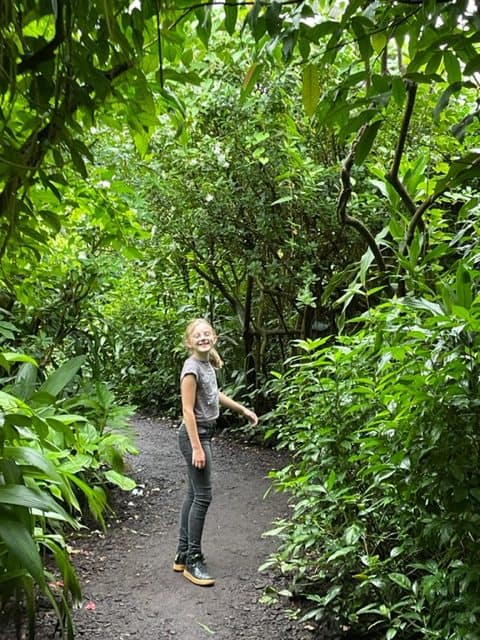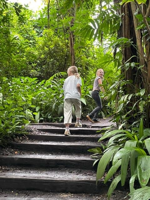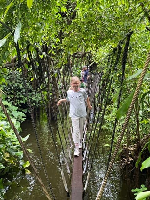 Na deze welkome onderbreking zijn we naar de de Bush gegaan. Hier was het tropisch warm. Hier vindt je de mooiste planten en bomen, het voelt echt alsof je in de bush loopt. Bij dit gedeelte kan je ook allerlei paadjes in, over touwbruggetjes lopen, dat vonden de meiden heel leuk.