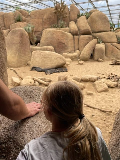 De desert was niet een grote zandwoestijn, wat we hadden verwacht, maar een echte rotswoestijn! Deze zijn te vinden in Arizona en het noorden van Mexico. Allerlei prachtige cactussen hebben we uitgebreid bekeken, de meiden waren verbaasd dat ze echt waren! Ook verschillende dieren hebben we hier bewonderd. De katfret (schattig!!), de rode lynx en de rode diamantratelslang. In het hok van deze slang lag ook nog de oude huid, gaaf om te zien.