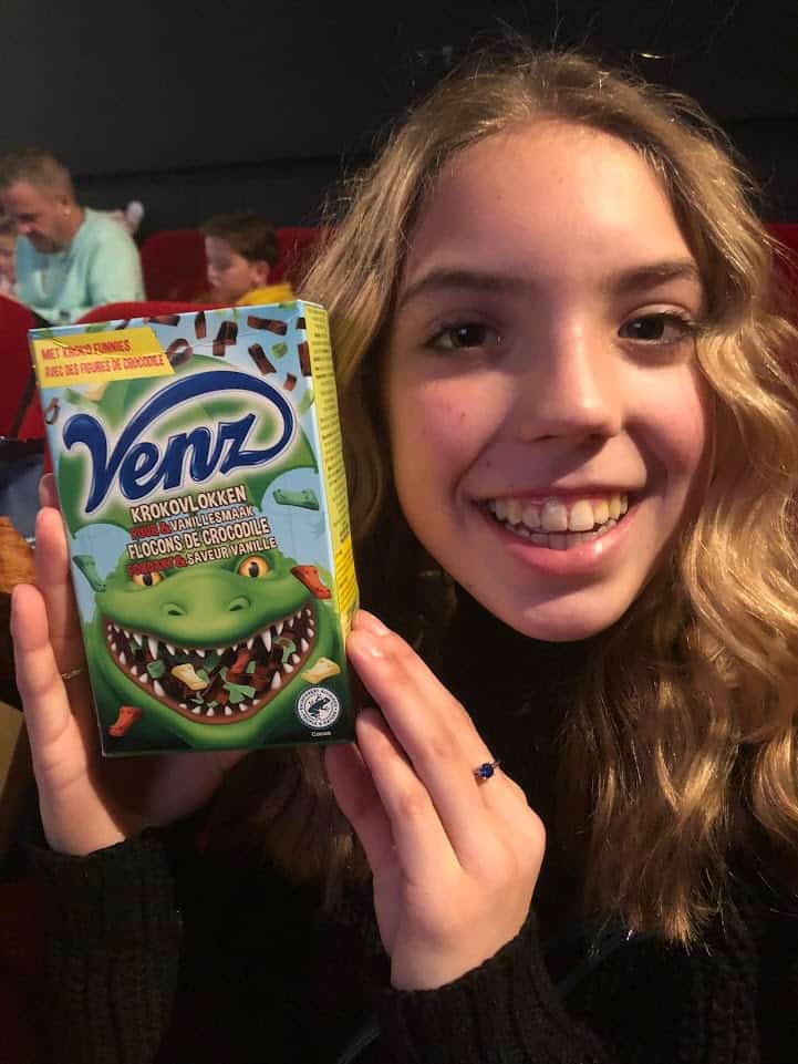 Als we in de hal van de grote bioscoop komen, krijgen we een polsbandje om en is alles prachtig versierd met groene en gouden ballonnen onder andere. Het ziet er heel feestelijk uit! We mogen naar de eerste verdieping en daar is het al flink druk. Er is een groene loper met veel bekende Nederlanders die stemmen hebben ingesproken of op een andere manier hebben meegewerkt aan deze film. We zien ook interviewers, veel camera’s, microfoons: er gaat een wereld voor ons open. Je kunt ook allerlei lekkers halen: croissantjes, krentenbolletjes, thee, sap, popcorn in 2 smaken en churro’s. Wat een luxe!
