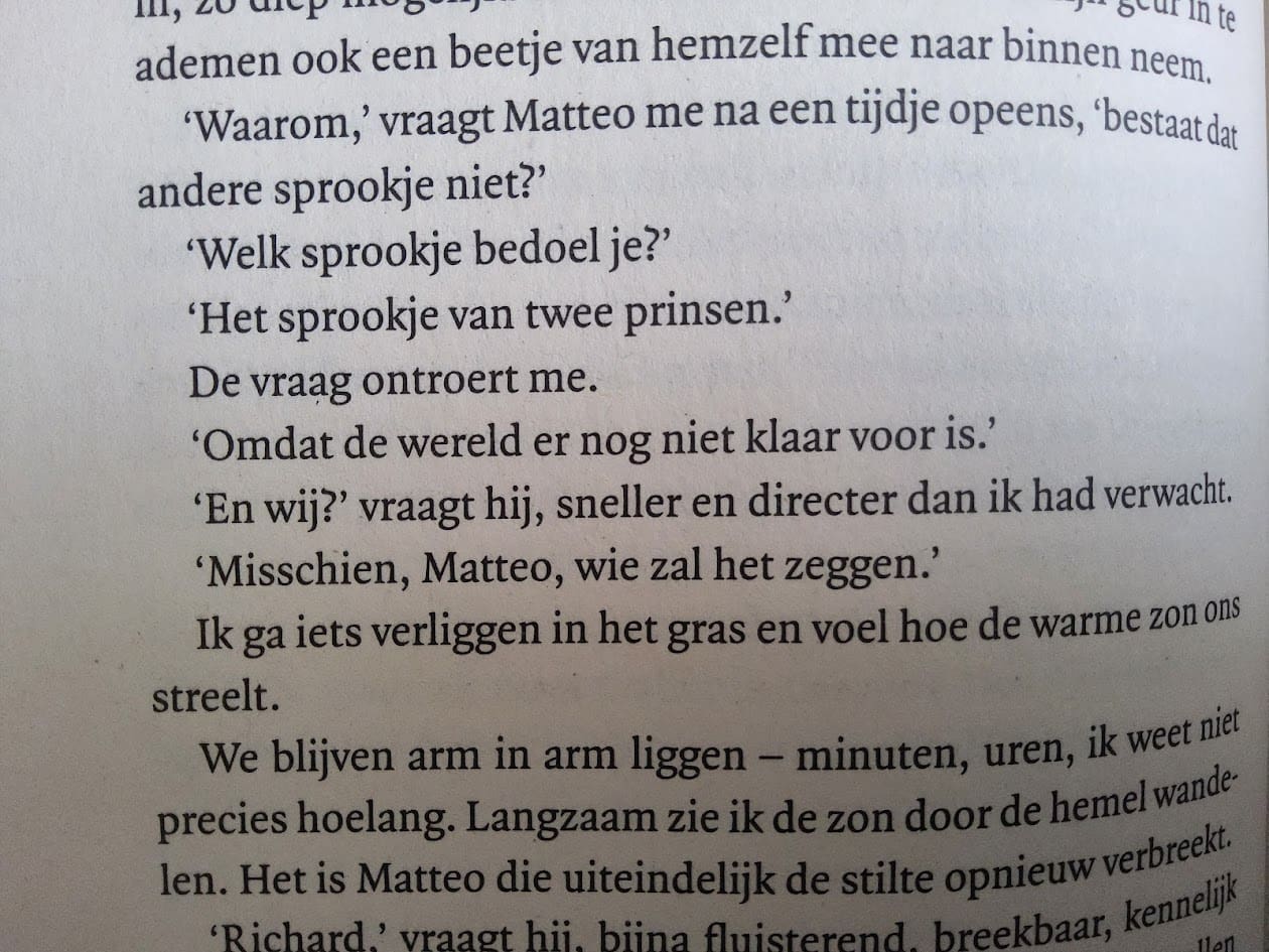 Een recensie over Twee Prinsen… dat is eigenlijk niet nodig vind ik. Want waarom zou ik op slakken zout gaan leggen wanneer het boek een must-read is, gewoon omdat het helaas nodig is om de verhalen te blijven vertellen die mensen aan het denken kunnen zetten. En hopelijk niet alleen denken, hopelijk zorgt het voor gesprekken, voor verandering. En uiteindelijk voor een wereld waarin iemand niet homoseksueel of hetero of non-binair of trans of wat dan ook is, maar waarin we mensen zijn, ongeacht geaardheid, kleur, religie of wat dan ook.