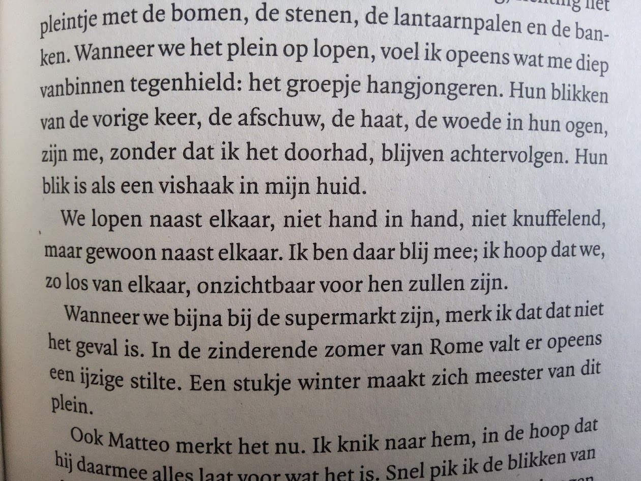 Wanneer Richard verteld dat hij op jongens valt, is de reactie van de vader nog veel heftiger dan ik had verwacht. Wetende dat het op een waargebeurd verhaal gebaseerd is, moest ik het boek echt een aantal uren wegleggen. Met de opbouw naar dit moment, zie je ook het prachtige liefdesverhaal in Rome naar een dreigendere sfeer gaan, een onontkoombaar gevaar dreigt. En ook dat is veel heftiger dan ik had voorzien.