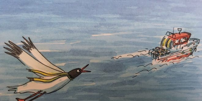 Het is het begin van een lange tocht, met heel wat tussenstops op vreemd terrein voor onze dappere meeuw, vanaf de zee helemaal tot aan Parijs. Het lukt haar maar niet om haar vis te bemachtigen, steeds is iemand haar te snel af. Zal ze er toch nog van kunnen smullen?